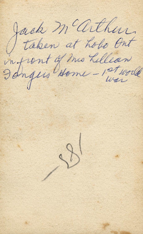 Jack McArthur taken at Lobo Ont in front of Mrs Lilian Fergus Home- 1st World War