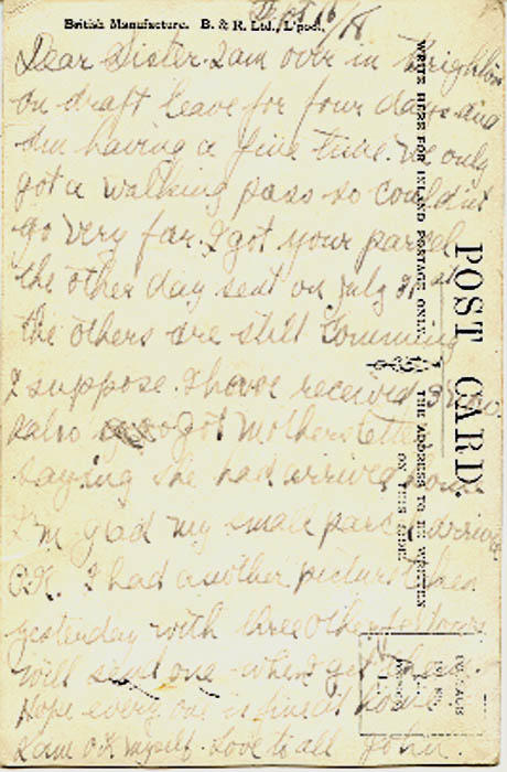 Sept 16/18 Dear Sister. I am over in Brighton on draft leave for four days and am having a fine time. we only got a walking pass so couldn't go very far. I got your parcel the other day sent on July 31st the others are still coming I suppose. I have received 3 now. I also got mothers letter say she had arrived home. I'm glad my small parcel arrived OK. I had another picture taken yesterday with three other fellows will send one when I get them. Hope every one is fine at home. I am OK...