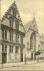 Postcard featuring a church from Ypres, Belgium. In Dutch,it states "Voorgevel van het Godshuis Belle" (Frontage of a beautiful church).