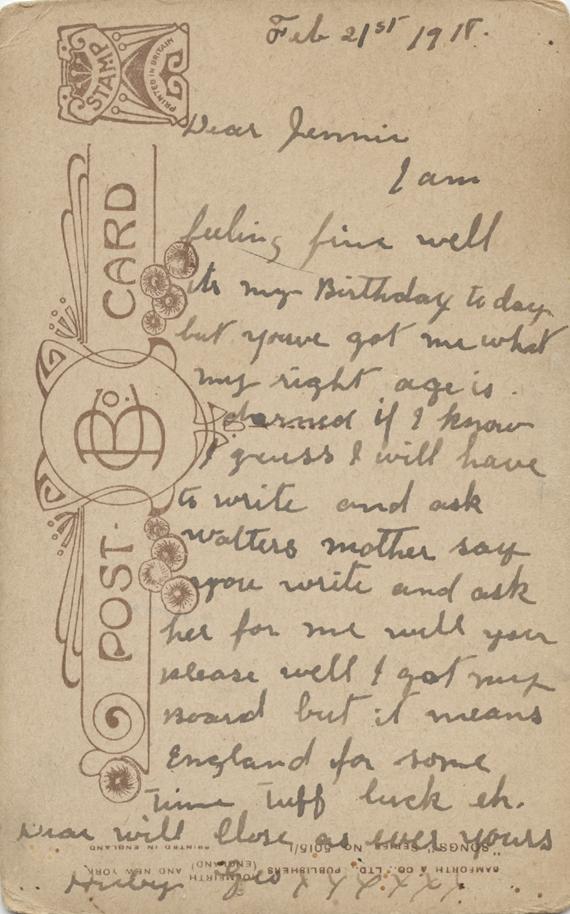 I am feeling fine well its my Birthday today but you’ve got me what my right age is. Darned if I know I guess I will have to write and ask Walters mother say you write and ask her for me will you please well I got my Board but it means England for some time tuff luck eh. [?] will close as ever yours