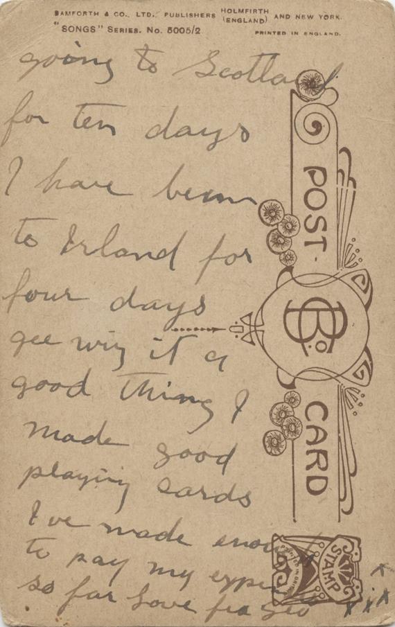Going to Scotland for ten days I have been to Irland for four days gee wiz it a good thing I made good playing cards Ive made enough to pay my expenses so far Love from Geo xxxx