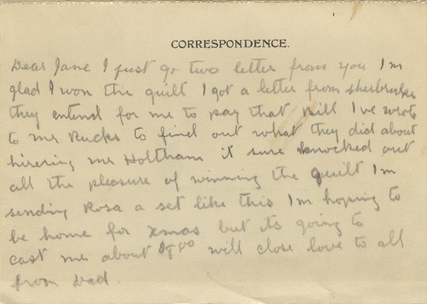 Dear Jane I just go two letter from you Im glad I won the quill I got a letter from [?] they intend for me to pay that Bill Ive wrote to Mr Rucks to find out what they did about hirering Mr Holtham it sure knocked out all the pleasure of winning the quill Im sending Rosa a set like this Im hoping to be home for Xmas but its going to cost me about $8.00 will close love to all