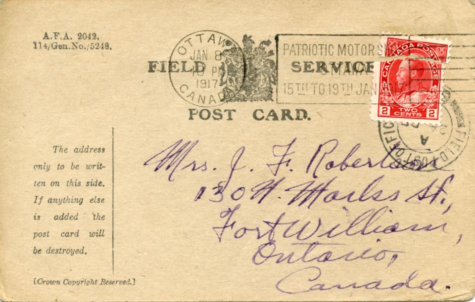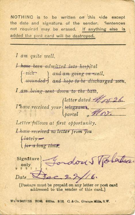 Robertson, Gordon Stuart Postcard: 1916 December 22nd
