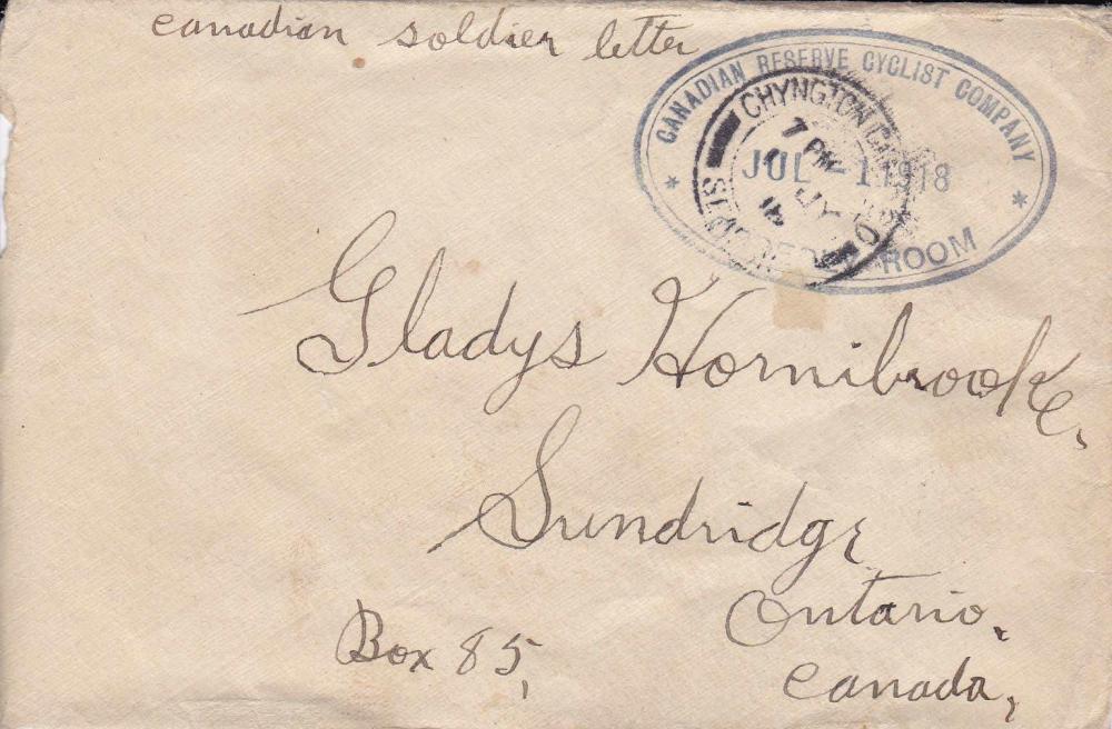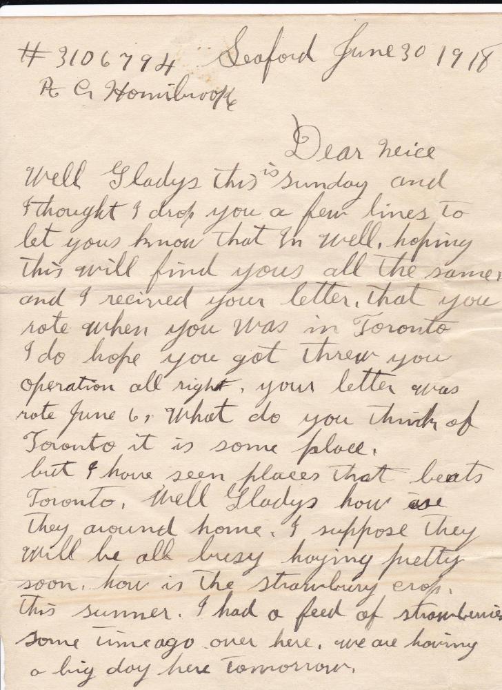 Well Gladys this is Sunday and I thought I drop you a few lines to let yous know that I’m well, hoping this will find yous all the same, and I recived your letter, that you rote when you was in Toronto I do hope you got threw you operation all right, your letter was rote June 6, what do you think of Toronto it is some place, but I have seen places that beats Toronto, Well Gladys how are they around home. I suppose they will be all busy haying pretty soon, how is the strawbeery crop, this sumer. I had a feed of strawberries some time ago over here. We are having a big day here tomorrow.