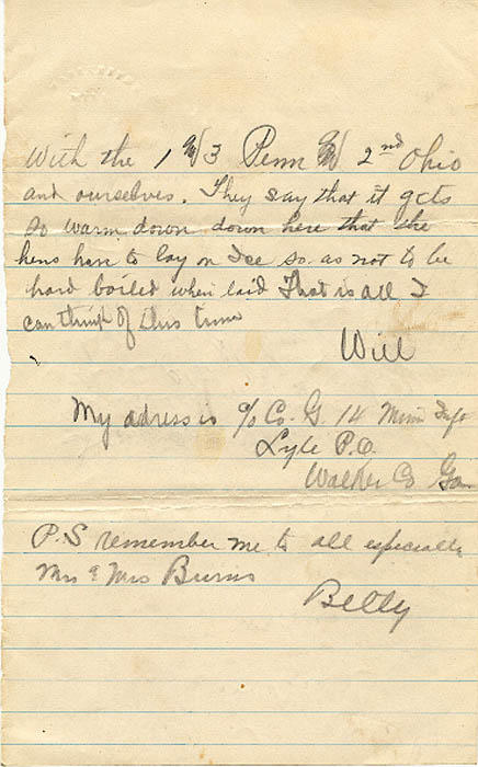 My adress is c/o o. G 14 Minn Inft Lyle P.O. Walker Co Ga