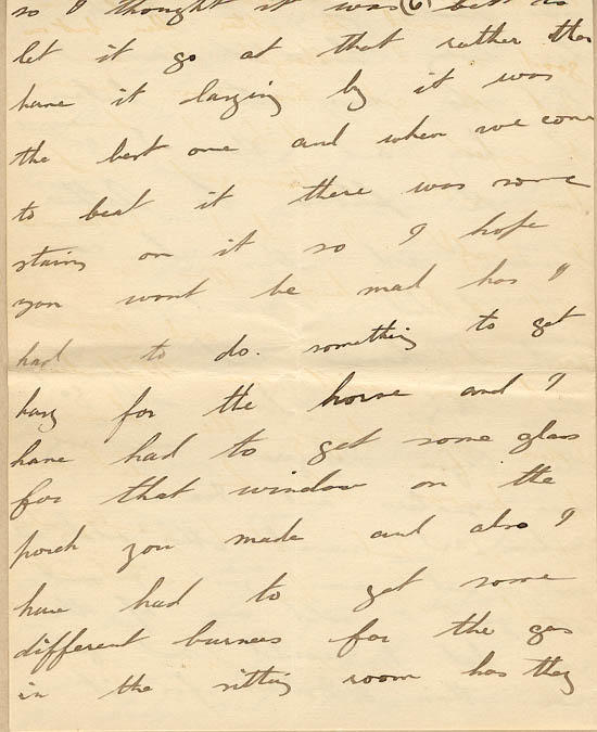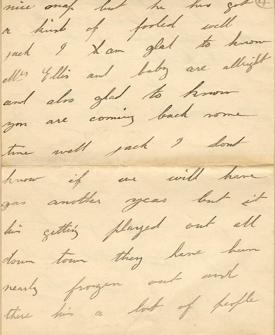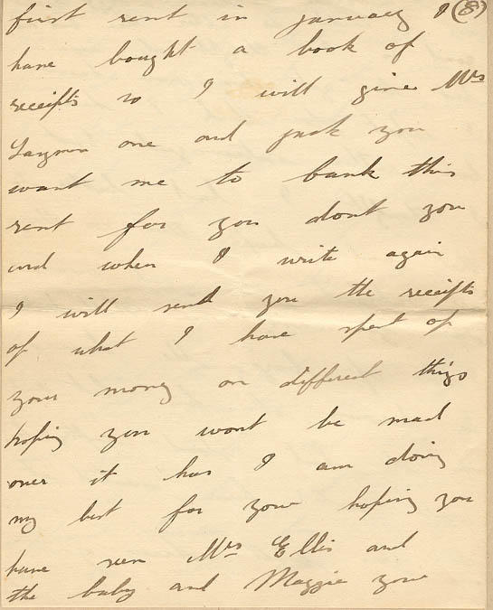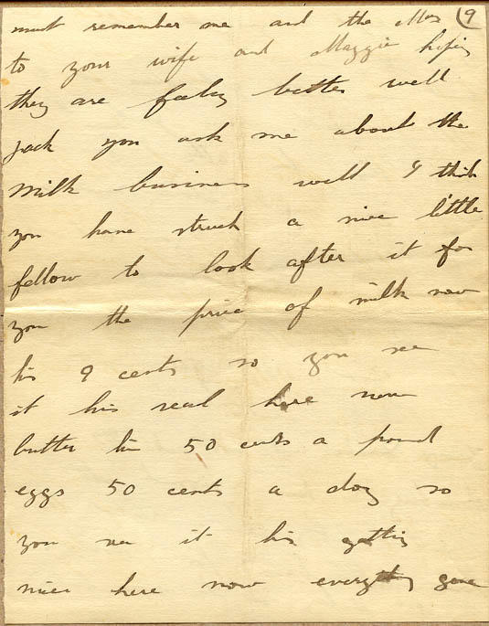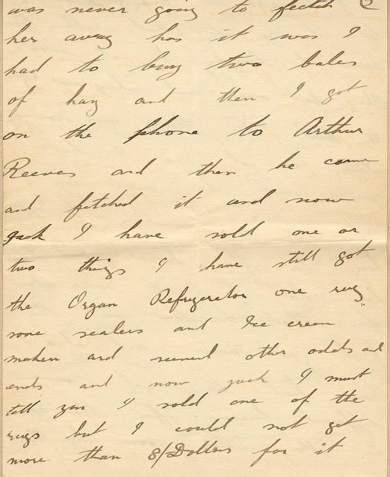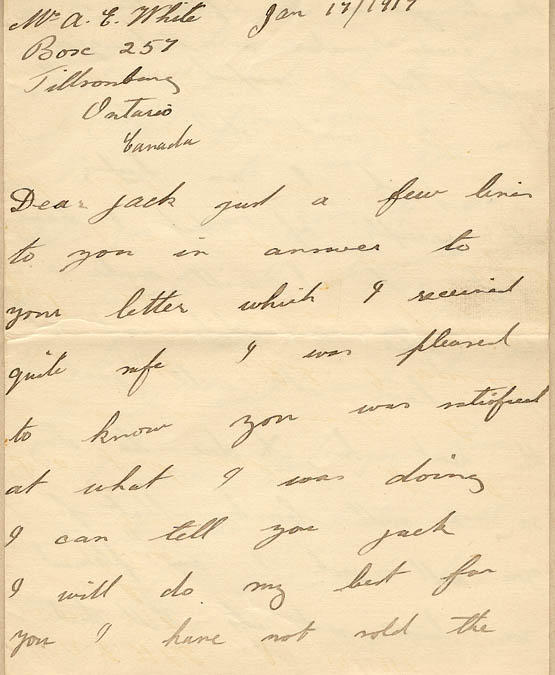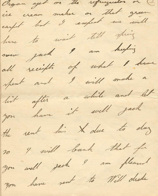 Just a few lines to you in answer to your letter which I received quite safe I was pleased to know you was satisfied at what I was doing I can tell you Jack I will do my best for you I have not sold the Organ yet or the refrigerator or ice cream maker or that green carpet but I expect we will have to wait till spring now Jack I am keeping all receipts of what I have spent and I will make a list after a while and let you have it well Jack the rent his due to day so I will bank that for you well Jack I am pleased you have sent to Will drake has he has been down to me and he was going to collect the rent if he had not heard from you and he wanted me to ask you what you was going to do has regards the payments of the house has he said he could not wait much longer so I am glad you have sent to him that will fool him I expect he thought he had got a nice snap but he has got a kind of fooled well Jack I am glad to know Mrs Ellis and baby are allright and also glad to know you are coming back some time well Jack I don't know if we will have gas another year but it his getting played out all down town they have been nearly frozen out and there his a lot of people was never going to fetch her away has it was I had to bring two bales hay and then I got on the phone to Arthur Reeves and then he came and fetched it and now Jack I have sold one or two things I have still got the Organ Refrigerator one rug some sealers and Ice cream maker and several other odds and ends and now Jack I must tell you I sold one of the rugs but I could not get more than 8/Dollars for it so I thought it was best to let it go at that rather than have it laying by it was the best one and when we come to beat it there was some stains on it so I hope you wont be mad has I had to do something to get hay for the horse and I have had to get some glass for that window on the porch you made and also I have had to get some different burners for the gas in the sitting room has they could not see to read and I tried all I could to alter them but no good so I thought it was best to get two more burners I expect to thing I have been rather extravagant but I thought I had better do that and keep them so they are satisfied now and now Jack you will see Will drakes Idea of buying the house he knowns it his let and if it had stood empty he would not have wanted it so you will draw your first rent in January I have bought a book of receipts so I will give Mrs Layman one and Jack you want me to bank this rent for you dont you and when I write again I will send you the receipts of what I have spent of your money on different things hoping you wont be mad over it has I am doing my best for you hoping you have seen Mrs Ellis and the baby and Maggie you must remember me and the Mrs to your wife and Maggie hoping they are feeling better well Jack you ask me about the Milk business well I think you have struck a nice little fellow to look after it for you the price of milk now his 9 cents so you see it his real here now butter his 50 cents a pound eggs 50 cents a doz so you see it his getting nicer here now everything gone up except wages that his one thing they never raise well never mind we will get over it suppose well now Jack think this his all I can say now so must close with my best respects to you and all from your true Friends Mrs and Mr A.E. White