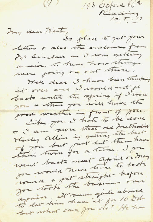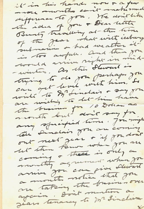 Like you I hate to be done & I am sure that old Methodist Wesley Allin is getting the best of you but just let them have this turn for a time. I you went back next April or May you would have time to look round & get straight before you took the business over again. It seems quite absurd to let him have it for 10Dols but what can you do? He has it in his hands now & a few more months can't make much difference to you. We don't like the idea of you & Dear little Bunty travelling at this time of the year what with iceburg submarines & bad weather it is too awful. And then you would arrive right in mid-winter. As this Stewart is trying to do you perhaps you can get level with him. So write to Mr Sinclair & say you are writing to let him have the business for 10 Dollars a month but don't say for any specified time. You might tell Sinclair you are coming out next year & if you don't let them know when you are coming & stress is only a monthly agreement when you arrive you can give Stewart a months notice that you are taking the business over again. Don't mention a years tenancy to Mr Sinclair simply tell him how disappointed you feel & say that you will take 10 Dols if he really can't get any more from Stewart. I suppose he had paid up allright, if so he will have paid off a good bit of your loan & by the time you go out it should be cleared off. So although it seems very little it will prove a help in the end as you will have no debts to go back too.
