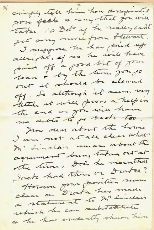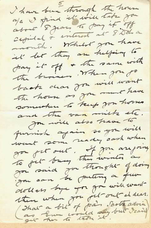 I should also ask him to take the rent for the house and take all the trouble off your hands, also for the business as well as you don't really know if Stewart is paying up to the other man. You had better tell Mr Sinclair the whole business so that he can know how it all stands. Ask Mr White to pay the taxes & hand over the balance in hand to Sinclair. I have been through the house a/c I find it will take you about 8 years to pay it off capital & interest at 8 Dols a month. Whilst you have it let they are helping to pay it off & the same with the business. When you go back dear you will want the house as you must have somewhere to keep you horses and the van milk etc.