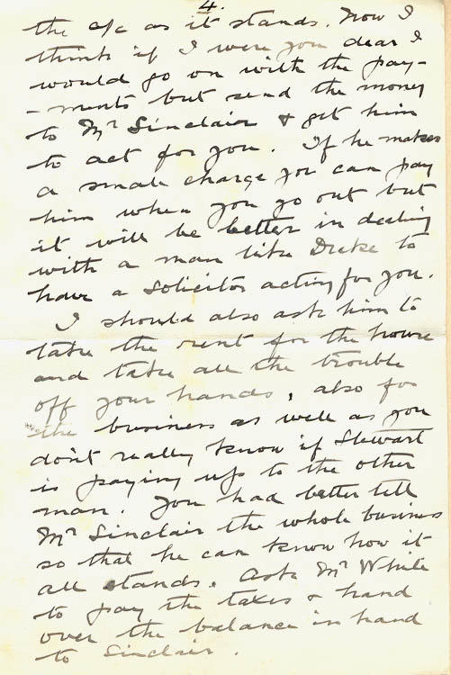 However your position seems clear as Drake has made a statement to Mr Sinclair which he can substantiate & he has evidently shown him the a/c as it stands. Now I think if I were you dear I would go on with the payments but send the money to Mr Sinclair & get him to act for you. If he makes a senate[?] charge you can pay him when you go out but it will be better in dealing with a man like Drake to have a Solicitor acting for you.
