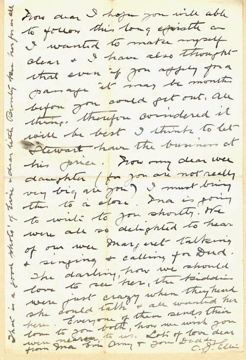 Now dear I hope you will able to follow this long epiratte[?] as I wanted to make myself clear & I have also thought that even if you apply for a passage it may be months before you could get out. All things therefore considered it will be best I think to let Stewart have the business at his price. Now my dear wee daughter (for you are not really very big are you) I must bring this to a close. Ma is going to write to you shortly. We were all so delighted to hear of our wee Margaret talking & singing & calling for Dad. The darling, how we should love to see her, the kiddies were just crazy when they heard she could talk & all wanted her here. Everyone of them sends their love to you both, how we wish you were nearer to us. Lots of love dear from Ma Evie Army[?] & your Daddy
