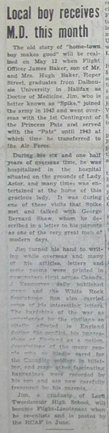 The old story of "home-town boy makes good" will be realized on May 12 when Flight Officer James Baker, son of Mr. and Mrs. Hugh Baker, Roper Street, graduates from Dalhousie University in Halifax as Doctor of Medicine. Jim, who is better known as "Spike," joined the army in 1943 and went overseas with the 1st Contingent of the Princess Pats and served with the "Pats" until 1943 at which time he transferred to the Air Force.