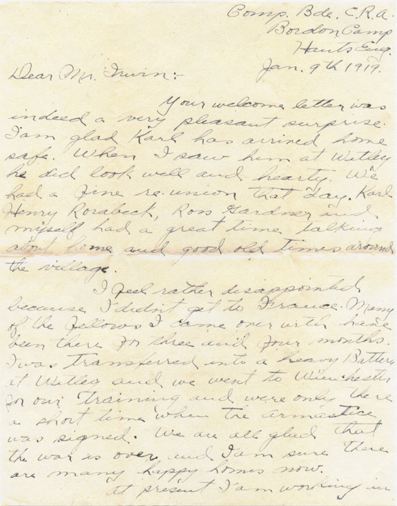Your welcome letter was indeed a very pleasant surprise. I am glad Karl has arrived home safe. When I saw him at Witley he did look well and hearty. We had a fine re-union that day. Karl Henry Ronabeck, Ross Gardner and myself had a great time talking about home and good old times around the village.