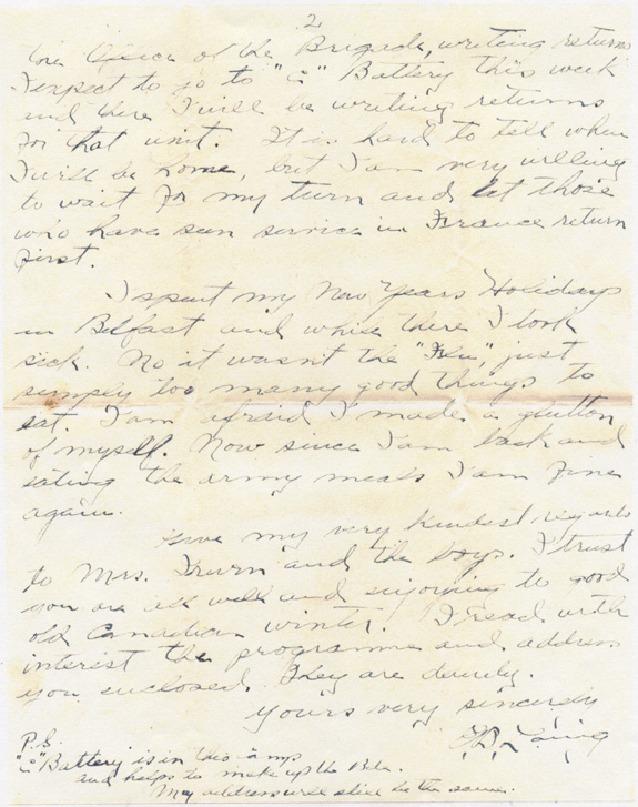 I feel rather disappointed because I didn’t get to France. Many of the fellows I came over with have been there for three and four months. I was transferred into a heavy Battery at Witley and we went to Winchester for our training and were only there a short time when the Armistice was signed. We are all glad that the war is over and I am sure there are many happy homes now.