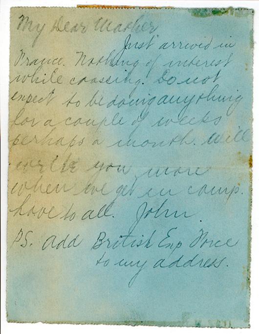 Just arrived in France. Nothing of interest while crossing. Do not expect to be doing anything for a couple of weeks perhaps a month. Will write you more when we get in camp. Love to all. John