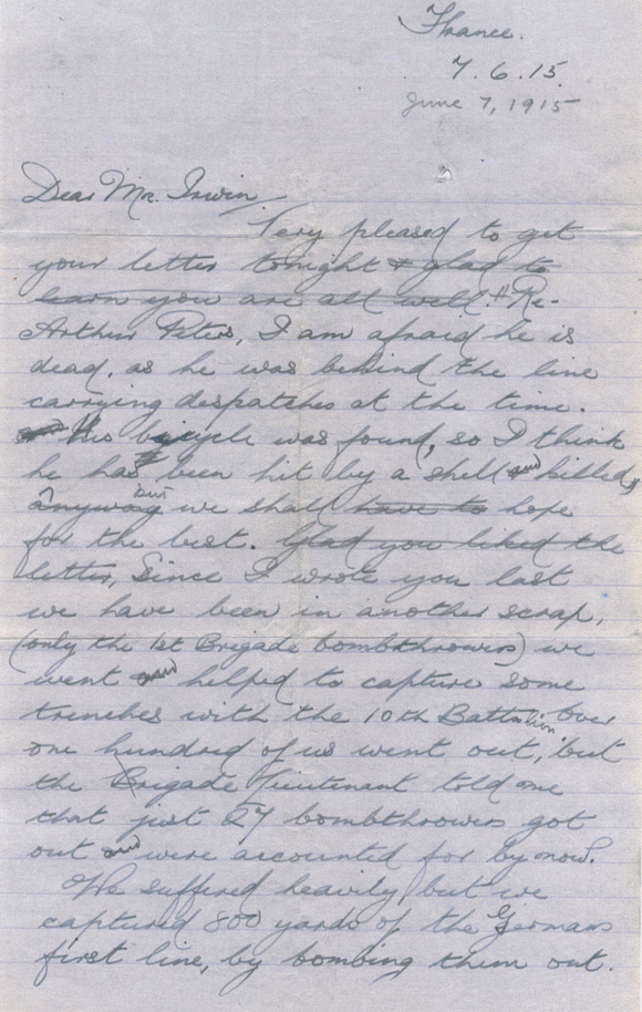 Very pleased to get your letter tonight & glad to learn you are all well. #Re- Arthur Peters, I am afraid he is dead, as he was behind the line carrying despatches at the time. His bicycle was found, so I think he has been hit by a shell and killed, but anyway we shall have to hope for the best. Glad you liked the letter, Since I wrote you last we have been in another scrap, (only the 1st Brigade bombthrowers) we went and helped to capture some trenches with the 10th Battalion over one hundred of us went out, but the Brigade Lieutenant told me that just 27 bombthrowers got out and were accounted for by now.