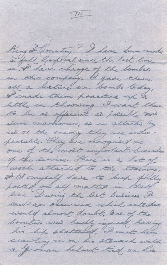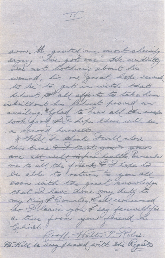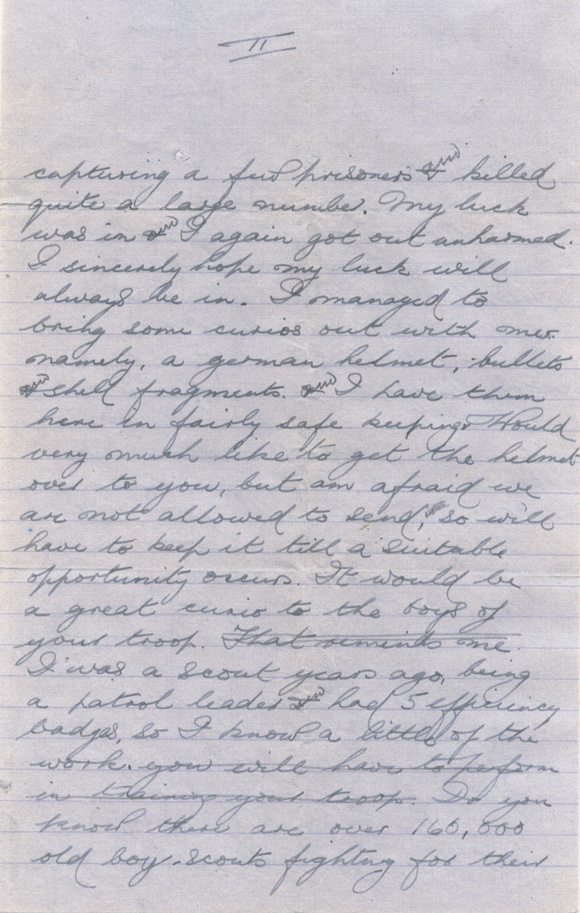 We suffered heavily, but we captured 800 yards of the Germans first line, by bombing them out capturing a few prisoners and killed quite a large number. My luck was in and I again got out unharmed. I sincerely hope my luck will always be in. I managed to bring some curios out with me namely, a german helmet, bullets and shell fragments. and I have them here in fairly safe keeping. Would very much like to get the helmet over to you, but am afraid we are not allowed to send, so will have to keep it till a suitable opportunity occurs. It would be a great curio to the boys of your troop. That reminds me I was a scout years ago, being a patrol leader and had 5 efficiency badges, so I know a little of the work. Do you know there are over 160,000 old boy- scouts fighting for their King and Country? I have been made a full Corporal since the last time in, and have charge of the bombers in this company. I gave them all a lecture on bombs today, and made them practice up a little in throwing. I want them to be as efficient as possible and sure marksmen, as in attacks by us or the enemy they are indispensable. They are recognized as one of the most important branches of the service. There is a lot of work attached to the training, and I myself have to keep fully posted on all matters in that line. During the last business I saw an occurrence which outsiders would almost doubt. One of the bombers was badly injured having his hip shattered, I met him crawling in on his stomach with a German helmet tied on his arm. He greeted me most cheerily saying “I’ve got one.” He evidently was not bothering about his wound, his one great hope seemed to be to get in with that helmet, and all efforts to take him in without his helmet proved unavailing. # Glad to hear all the crops look good and I hope there will be a record harvest.