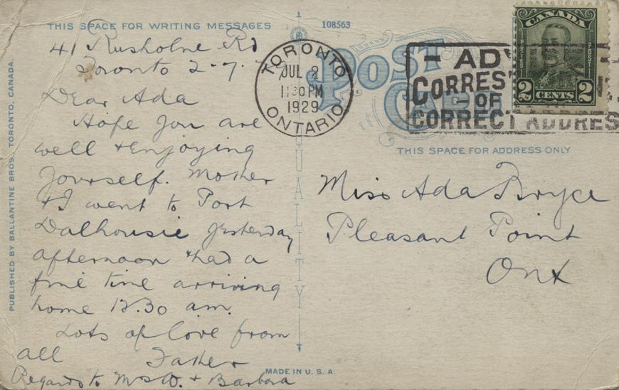 Hope you are well & enjoying yourself. Mother & I went to Port Dalhousie yesterday afternoon & had a fine time arriving home 12.30 am.