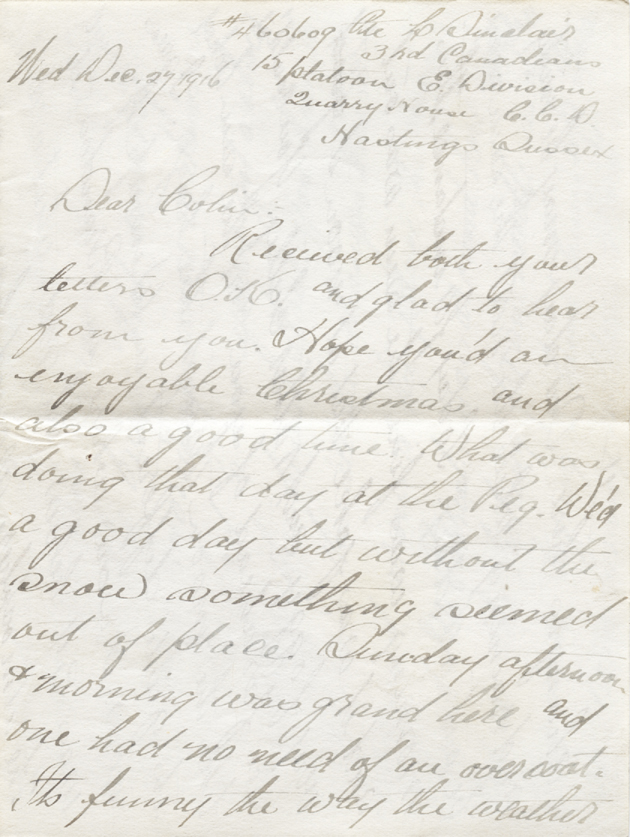 Received both your letters O.K. and glad to hear from you. Hope you’d an enjoyable Christmas and also a good time. What was doing that day at the Peg. We’d a good day but without the snow something seemed out of place. Sunday afternoon & morning was grand here and one had no need for an over coat.