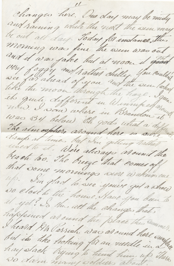 Its funny the way the weather changes here. One day may be widy and raining while the next the sun may be out all day. Today for instance. This morning was fine the sun was out and it was jake but at noon it got very foggy and rather chilly. You couldn’t see far ahead of you and the sun looked like the moon through the haze. I guess its quite different in Winnipeg around now. I saw where in Brandon it was 34 below “Eh gods what a difference.”