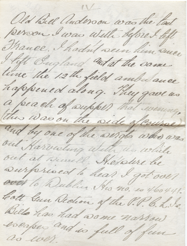 Old Bill Anderson was the last person I was with before I left France. I hadn’t seen him since I left England and at the same time the 12th field ambulance happened along. They gave us a peach for supper that evening, (this was on the side of course) and by one of the sergts who was out Harvesting with us while out at Sewell. He’d sure be surprised to hear I got over to Dublin. His no. is 460441. Colt Gun Section of the P.P.C.L.Is.