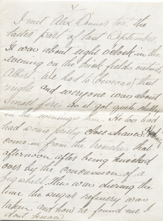 I met Alex Donner too, the latter part of last September. It was about eight o’clock in the evening on the buck fields outside Albert. We had to ([?]) that night and everyone was about small fires as it got quite chilly in the evenings then. He too had had some pretty close shaves. Had come in from the trenches that afternoon after being knocked over by the concussion of a big shell. This was during the time the sugar refinery was taken and how he found me I dont know.