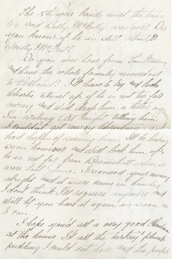 Do you ever hear from Tom Murray and have the whole family moved out to Portland? I’ll have to try and look Charlie Stuart up, if he is not too far away and will drop him a letter anyway. I’m writing Art tonight telling him I couldn’t get away Christmas as I had hopes of seeing him. Ill be leaving soon however and will look him up, he is not far from Bramshott where we were last June. Ireceived your money alright and it sure came in handy I don’t think I’ll require anymore and will let you have it again as soon as I can.
