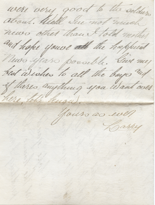 I hope you’d all a very good Christmas at the house I’d all the turkey & plumb pudding I could eat here and the people were very good to the soldiers about. Well Ive not much news other than I told mother and hope youve the happiest News years possible. Give my best wishes to all the boys and if theres anything you want over here, let’s know.