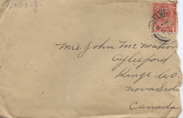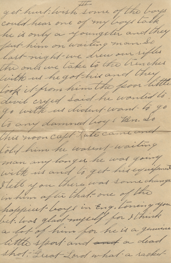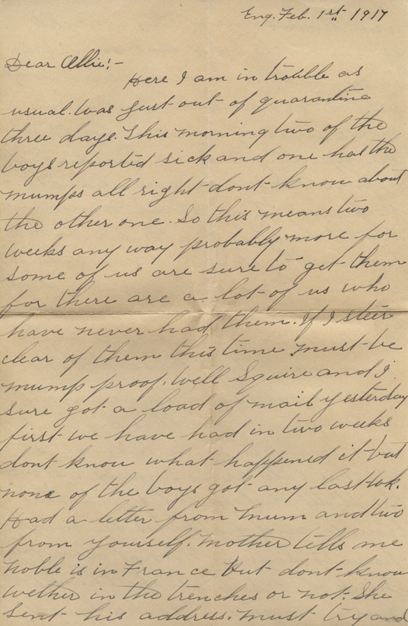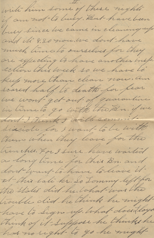Well Squire and I sure got a load of mail yesterday.  First we have had in two weeks.  Don’t know what happened to it but none of the boys got any last week.  Had a letter from Mum and two from yourself.  Mother tells me Noble is in France but don’t know whether is in the trenches or not.  She sent his address.  Must try and write him some of these nights if am not too busy.  But have been busy since we came in cleaning up and it’s 8:30 now.  We don’t much time to ourselves for they are expecting to have another inspection this week so we have to keep more than clean now.  Am scared half to death for fear we won’t get out of quarantine in time to go with the Bn. if we don’t I think I will commit suicide for I want to be with them when they leave for the trenches.  For I sure have waited a long time for this Bn. and don’t want to have to leave it at this late hour.  So Tommy left for the States did he?  What was the trouble?  Did he think he might have to Sign up?  What does Lloyd think of it?  Suppose he thinks he has no right to go he might get hurt.  With some of the boys could hear one of my boy’s talk.  He is only a youngster and they put him on waiting man.  So last night we drew our rifles, the ones we take to the trenches with us, he got his and they took it from him.  The poor little devil cried.  Said he wanted to go with us.  Didn’t want to go to any damned boys Bn. so this noon Capt. Lute came and told him he wasn’t waiting man any longer.  He was going with us and to get his equipment.  I tell you there was some change in him after that.  One of the happiest boys in England you bet.  Was glad myself for I think a lot of him for he is a genuine little sport and a dead shot.  Great Lord, what a racket!  It’s a hell of a place to write with all this bunch yelling and jumping around.  Well Angus got clear of quarantine this time.  He was up at the dentists all day so they let him stay out.  He is a lucky boy for it’s no fun being penned up all the time.