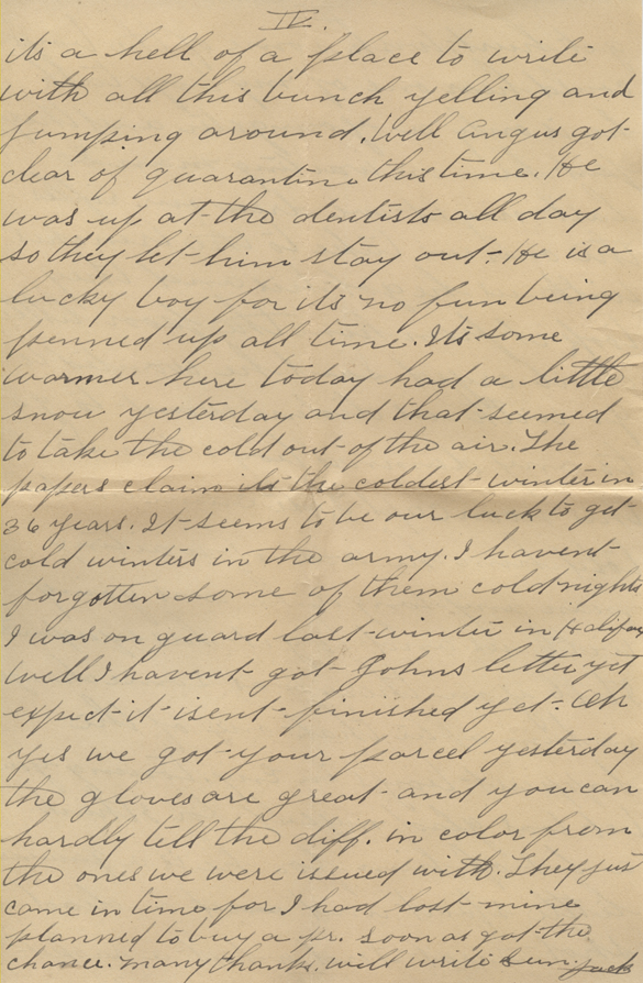 It’s some warmer here today.  Had a little snow yesterday and that seemed to take the cold out of the air.  The papers claim it’s the coldest winter in 36 years.  It seems to be our luck to get cold winters in the army.  I haven’t forgotten some of them cold nights I was on guard duty last winter in Halifax.  Well I haven’t got John’s letter yet.  Expect it isn’t finished yet.  Oh yes, we got your parcel yesterday.  The gloves are great and you can hardly tell the difference in color from the ones we were issued with.  They just came in time for I had lost mine.  Planned to buy a pair soon as I got the chance.  Many thanks.  Will write Sun.