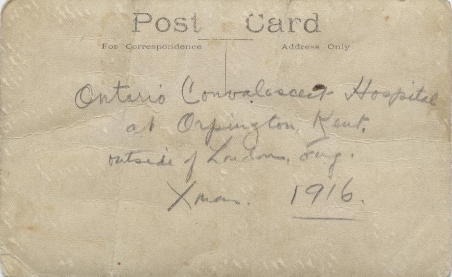 Postcard, Ontario Convalescent Hospital at Orpington Kent , outside of London Eng., December 25, 1916, back