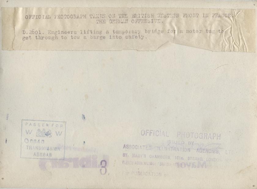 Photo, Official Photograph taken on the British Western Front in France. The German Offensive. D.2601. Engineers lifting a temporary bridge for a motor tug to get through to tow a barge into safety, nd, Back.