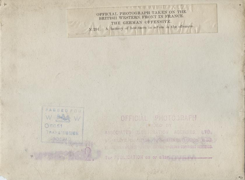 Photo, Official Photograph Taken on the British Western Front in France. The German Offensive,N.291. A battery of howitzers in action on the offensive, nd, Back.