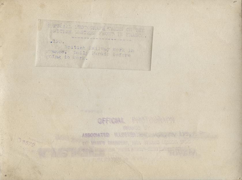 Photo, N.190. British Railway work in France. Daily parade before going to work, nd, Back.
