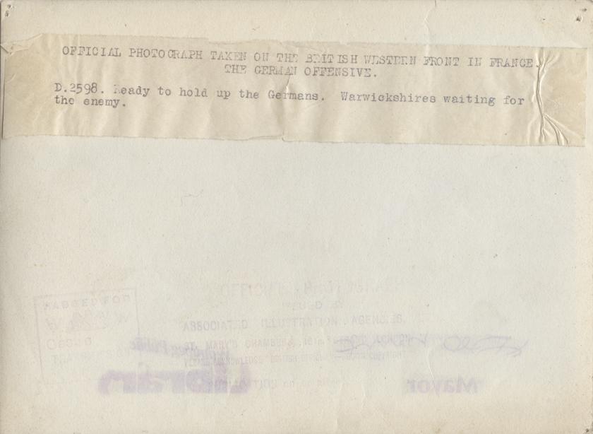 Photo, Official Photograph Taken on the British Western Front in France. The German Offensive. D.2598. Ready to Hold up the Germans. Warwickshires waiting for the enemy, nd, Back.