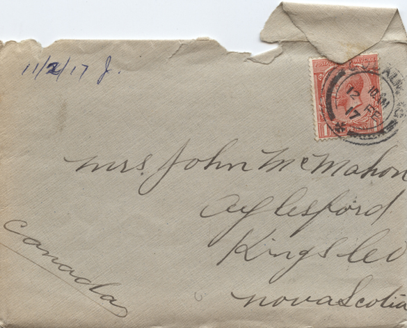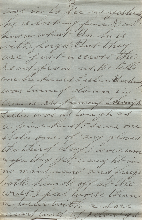Well Lloyd Durling was in to see us yesterday.  He is looking fine.  Don’t know what Bn. he is with, forget.  But they are just across the road from us.  He tells me he heard Leslie Barteaux was turned down in France.  It’s funny though; Leslie was as tough as a pine knot.  Some one stole one of my gloves the third day I wore um.  Hope they get caught in no man’s land and freeze both hands off at the wrist.  I feel worse than a bear with a sore head and if I don’t get out of here reckon I will be some worse.  But I haven’t given up hopes yet.  I have a desperate cold and some times my throat is sore but that only adds a few more gray hairs to my head.