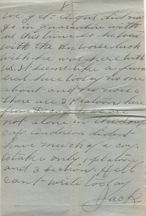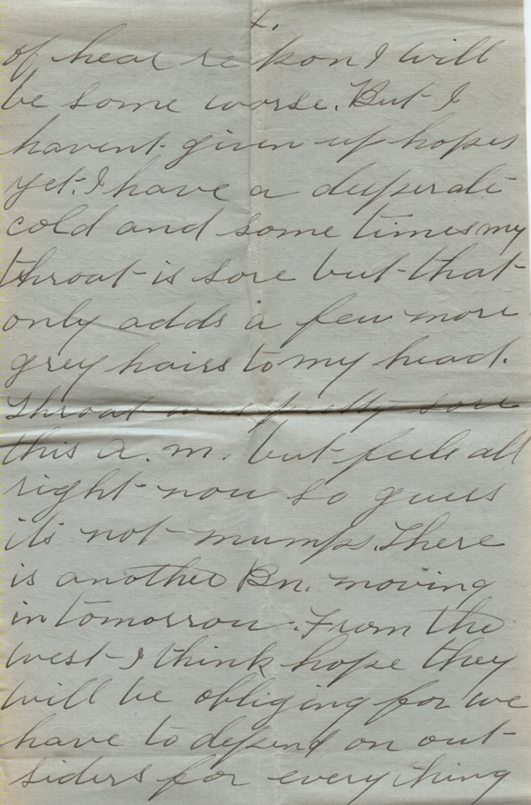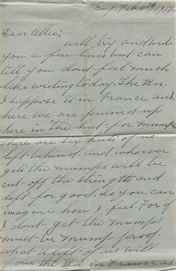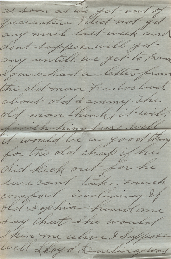 Will try and write you a few lines but can tell you don’t feel much like writing today.  The Bn. I suppose is in France and here we are penned up here in the hut for mumps.  There are six huts of us left behind and whoever gets the mumps will be cut off the strength and left for good.  So you can imagine how if feel.  For if I don’t get the mumps must be mump-proof.  What is left of us will join the Bn. in France as soon as we get out of quarantine.  I did not get any mail last week and don’t suppose will get any until we get to France.  Squire had a letter from the old man Fri.  Too bad about old Sammy.  The old man thinks it will finish him sure.  Well I would be a good thing for the old chap if he did kick out for he sure can’t take much comfort in living.  If Sophia heard me say that she would skin me alive I suppose.