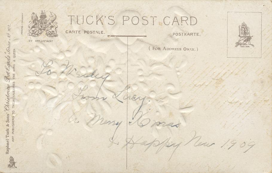 Postcard, To Wesley From Lucy. A Merry Xmas & Happy New 1909, December 26, 1909, back.