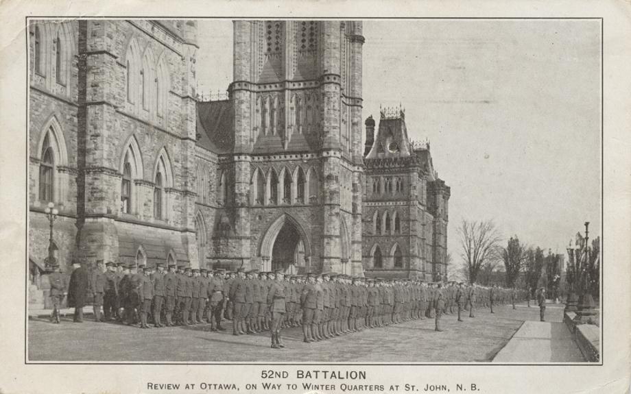 Postcard, 52nd Battalion, Rewiew at Ottawa, on Way to Winter Quarters at St. John, N.B., n.d., front.