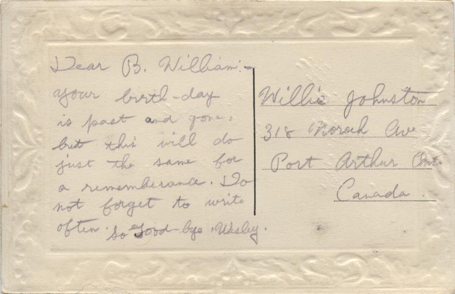Postcard, Dear B. William:- Your birth-day is past and gone, but this will do just the same for a remembrance. Do not forget to write often. So Good-bye, Wesley. Willie Johnston 318 Norah Ave Port Arthur Ont. Canada., n.d., back.