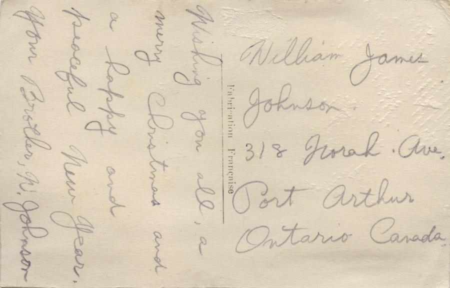 Postcard, Wishing you all, a merry christmas and a happy and peaceful new year. Your Brother, W. Johnson. William James Johnson, 318 Norah Ave. Port Arthur Ontario Canada., n.d., back.