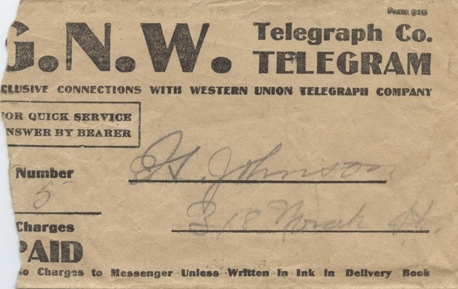 Telegram, G. Johnson 318 Norah Ave, September 13, 1917, envelope front.