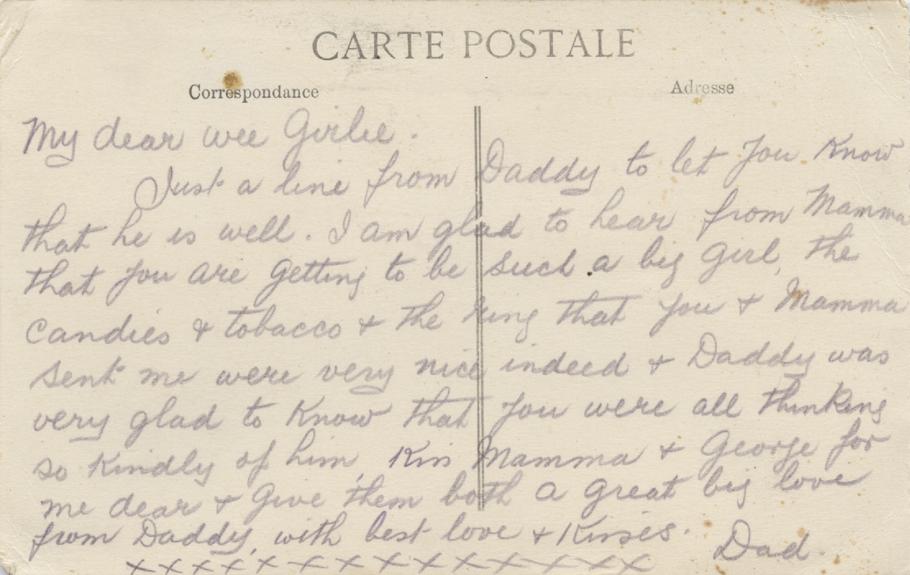 Just a line from Daddy to let you know that he is well. I am glad to hear from Mamma that you are getting to be such a big girl, the candies & tobacco & the ring that you & Mamma sent me were very nice indeed & Daddy was very glad to know that you were all thinking so kindly of him, Kiss Mamma & George for me dear & give them both a great big love from Daddy, with best love & Kisses.