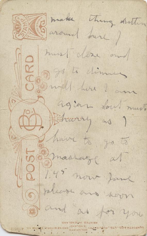 make thing rotten around here I must close and go to dinner well here I am agian but must hurry as I have to go to massage at 1.45 now Jane please and soon and as for you
