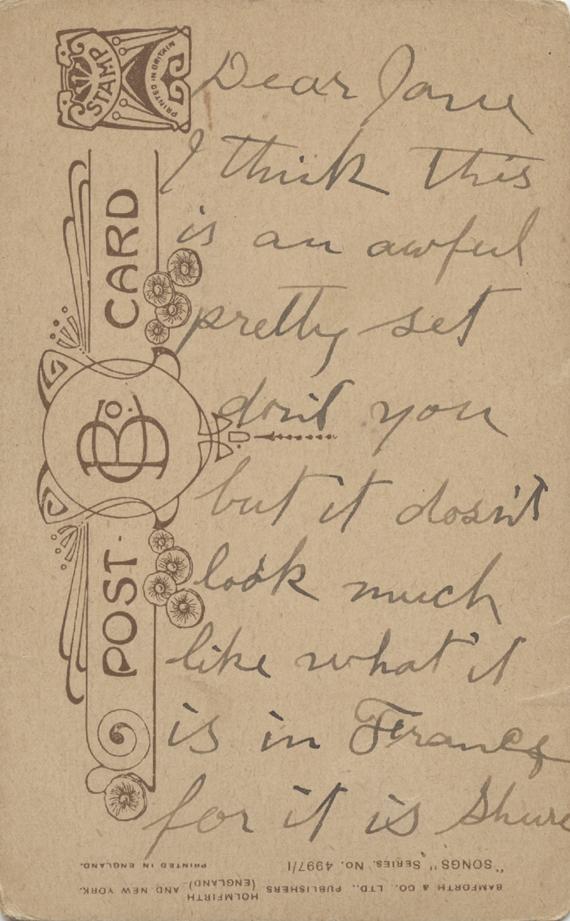 I think this is an awful pretty set don’t you but it dosn’t look much like what it is in France for it is Shure Hell over there I have tryed to find out were Hottie is and Eric but have made a poor success of it well I don’t know much to write only there is three more pieces of shrapnel coming out of my arm the d—thing heals up then brakes out again I don’t think I will go back to France for 6 months unless I get dam sick of staying Hospital which I am pretty near now