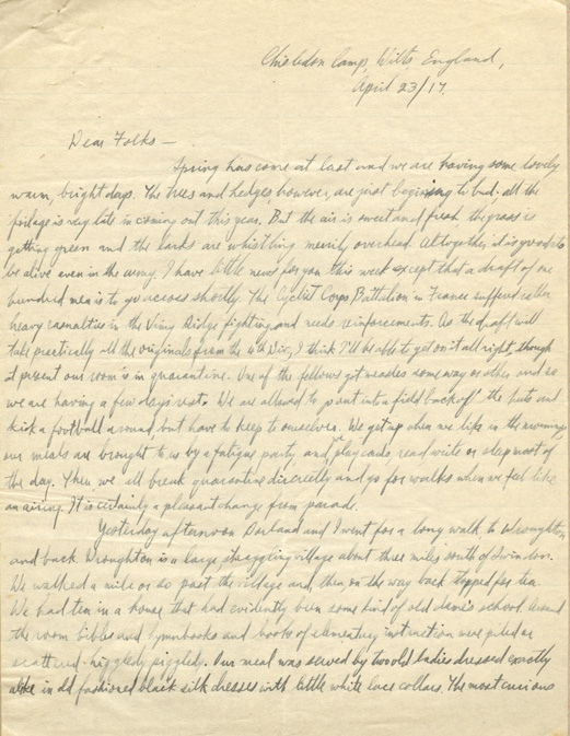 Spring has come at last and we are having some lovely warm, bright days. The trees and hedges, however, are just beginning to bud, all the foilage is very late in coming out this year. But the air is sweet and fresh, the grass is getting green and the larks are whistling merrily overhead. Altogether it is tood to be alive even in the army. I have little news for you this week except that a draft of one hundred men is to go across shortly. The Cyclid Corps Battalion in France suffered rather ehavy casualties in the Vimy Ridge fighting and needs reinforcements. As the draft will take practically all the origionals from the 4th Div, I think I’ll be able to get on it all right, though at present our room is in quarenting. One of the fellows got measles some way or other and so we are having a few days rest. We are allowed to go out into a field back of the huts and kick a football around but have to keep to ourselves. we get up when we like in the mornings our meals are brought to us by a fatigue party and we play cards, read, write, or sleep most of the day. Then we all break quarantine directly and go for walks when we feel like an airing. It is certainly a pleasant change from parade.