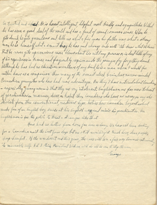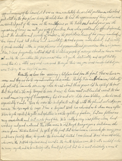 Recently we have been receiving a lot of men back from the front. There are two in our room and they are both very interesting characters. Paddy Fries is a Bohemian (literally) who got out to Canada someway when he was about three years old. In spite of the fact that English is the only tongue he has ever known, he has a most outlandish accent. He has a most amusing way of transposing his r’s and v’s like Dawn Weller, also his words especially I and a. Then he uses the definite article with the ph[?] and with proper names. For example he says “I hear a Serjeant Wale has advised us to clean our rifles.” When he gets excited heyells and splutters in a side splitting fashion, but our fellows are very considerate and don’t make fun of him. He is really a very nice fellow; clean, hard-working and good natured. The other man is old Hugh Macgregor a Scotchman who comes from ‘Kirkintulloch.’ In spite of the fact thathe has been in Canada for many years and has a family there, he speaks the broadest Scotch I ever heard. Mac is an old soldier who was in British regulars and served in the South African war. He is not a model of virtue in many respects and he is certainly not a beautiful object but he is most decidedly a man to be trusted and liked. He is honest, intelligent, helpful and most kindly and sympathetic. With[?] he has seen a good deal of the world and has a fund of sound common sense. When he gets drunk he gets gamalsus and tells us what a fine man his father was, what a strong man he is himself, what a smart boy he has and always ends with “Ah know what ah know.” But he never gets uproarious, never blows about his military prowess or in deed tells of any of his experiances in France, and frequently reprimands the younger fry for getting drunk. Although he has had no education in culture or any kind he is a man whom I would far rather have as a companion than many of the smarl aleck brainless narrow minded Canadian youngsters who have had more advantages. One thing I have noticed about Canadians –especially young ones- is that they are very intolerant. Englishmen are far more tolerant or peculiarities in manner, dress, or habit than Canadians who have no mercy on any who deviate from their conventional, mediocre type. Notice how Canadian boys at school make fun of an English boy, sneer at his English ways and mimic his peculiarities. An Englishman is far too polite to treat a stranger like that.