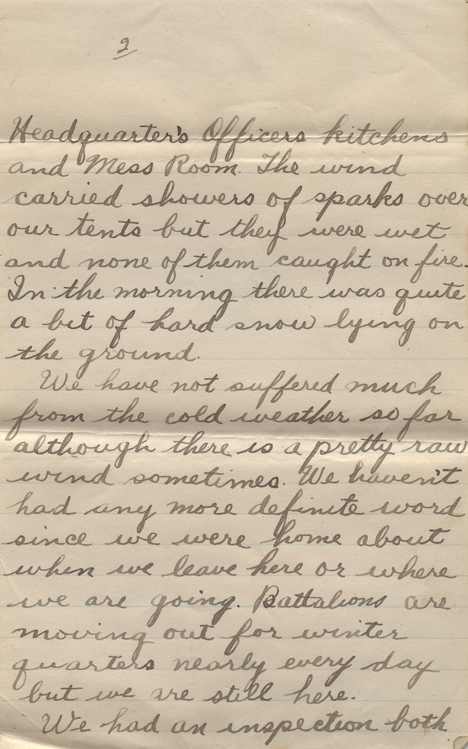 You would see by the paper that there has been a little snow here. Monday night there was a very high wind. We were called out in the middle of the night on account of a fire, which burnt the Headquarter's Officers kitchens and Mess Room. The wind carried showers of sparks over our tents but they were wet and none of them caught on fire. In the morning there was quite a bit of hard snow lying on the ground.
