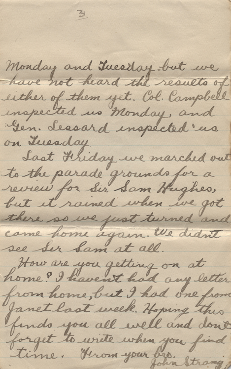 Last Friday we marched out to the parade grounds for a review for Sir Sam Hughes, but it rained when we got there so we just turned and came home again. We didn't see Sir Sam at all.