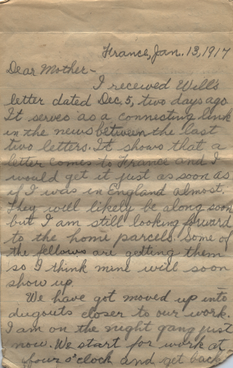 I received Will's letter dated Dec. 5, two days ago. It serves as a connecting link in the news between the last two letters. It shows that a letter comes to France and I would get it just as soon as if I was in England almost. They will likely be a along soon but I am still looking forward to the home parcels. Some of the fellows are getting them so I think mine will soon show up.