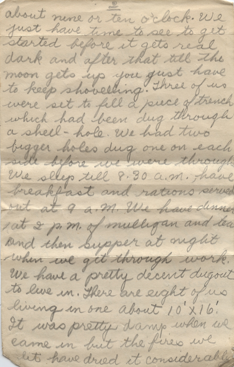 We have got moved up into dugouts closer to our work. I am on the night gang just now. We start for work at four o'clock and get back about nine or ten o'clock. We just have time to see to get started before it gets real dark and after that till the moon gets up you just have to keep shovelling. Three of us were set to fill a piece of trench which had been dug through a shell-hole. We had two bigger holes dug one on each side before we were through. We sleep till 8.30 a.m., have breakfast and rations served out at 9 a.m. We have dinner at 2 p.m. of mulligan and tea and then supper at night when we get through work. We have a pretty decent dugout to live in. There are eight of us living in one about 10' x 16'. It was pretty damp when we came in but the fires we lit have dried it considerably.
